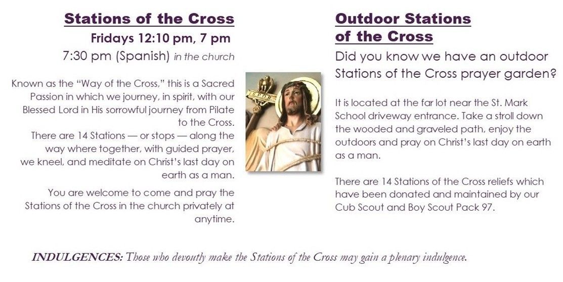 Pray the Stations of the Cross in the church: Fridays at noon, 7 pm or 7:30 pm (Spanish).
